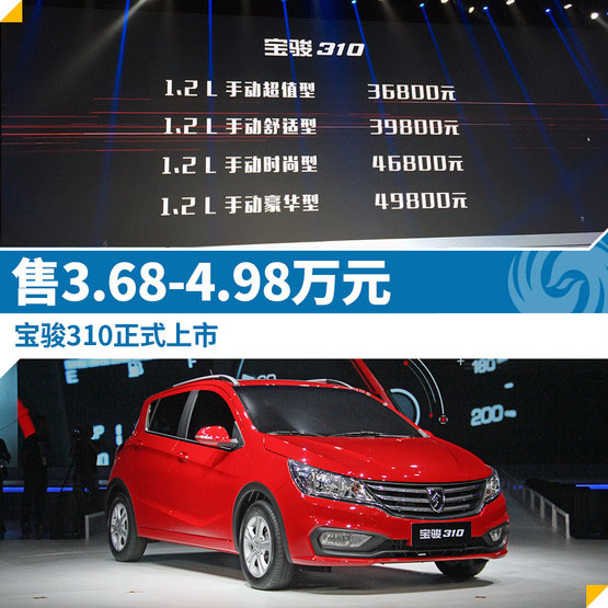 北京报道 2016年9月8日,“不等待 就现在”——上汽通用五菱宝骏310上市发布会于北京乐视体育生态中心正式举行。宝骏310曾于今年4月举行的北京车展期间首发亮相,是上汽通用五菱自主正向研发的全新平台轿车。新车全系搭载1.2升发动机,并根据配置的差异化推出包括超值型、舒适型、时尚型、豪华型在内的共计4款车型,其售价区间为3.68-4.98万